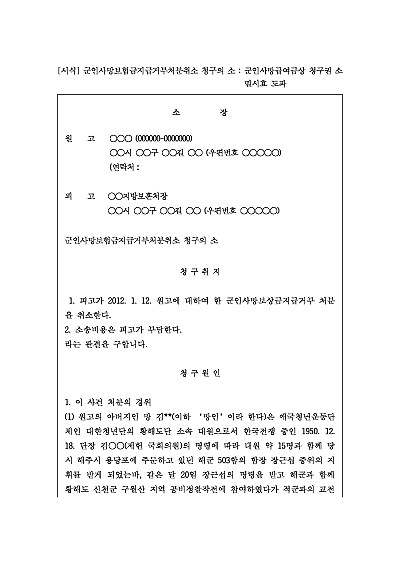 주요내용 : 군인이 공무 수행 중 사망하여 유족이 받아야 할 사망보험금(사망급여금) 지급을 관련 기관(국군재정관리단 등)이 소멸시효 완성, 사망 원인 불인정 등의 이유로 거부했을 때, 그 거부 처분이 위법함을 이유로 취소를 구하기 위한 목적으로 사용되어지는 소장 양식임. 단 무단전재 방지목적으로 PDF 파일로 올리니, 구매하신 후 혹 원본 파일이 필요하신 분들은 톡이나 문자, 메일, 전화 등을 주시면 작성방법 등에 대한 간단한 무료상담과 함께 원본 파일을 보내드리도록 하겠습니다.