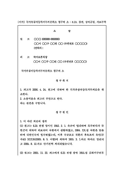 주요내용 : 국가보훈부(지방보훈청)가 신청인의 국가유공자(또는 보훈보상대상자) 등록 신청을 '거부'했을 때, 신청인이 당해 처분의 위법 또는 부당함을 이유로 그 취소를 구할 목적으로 사용되어지는 신청서 양식임. 단 무단전재 방지목적으로 PDF 파일로 올리니, 구매하신 후 혹 원본 파일이 필요하신 분들은 톡이나 문자, 메일, 전화 등을 주시면 작성방법 등에 대한 간단한 무료상담과 함께 원본 파일을 보내드리도록 하겠습니다.