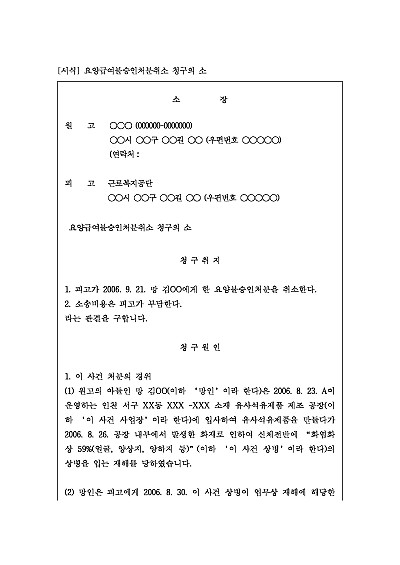 주요내용 : 근로복지공단 등이산재 요양급여 신청을 거부한 결정(불승인 처분)이 위법 또는 부당하다고 판단될 때 당해 처분의 취소 등을 구하기 위한 목적으로 사용되어지는 소장 양식임. 단 무단전재 방지목적으로 PDF 파일로 올리니, 구매하신 후 혹 원본 파일이 필요하신 분들은 톡이나 문자, 메일, 전화 등을 주시면 작성방법 등에 대한 간단한 무료상담과 함께 원본 파일을 보내드리도록 하겠습니다.