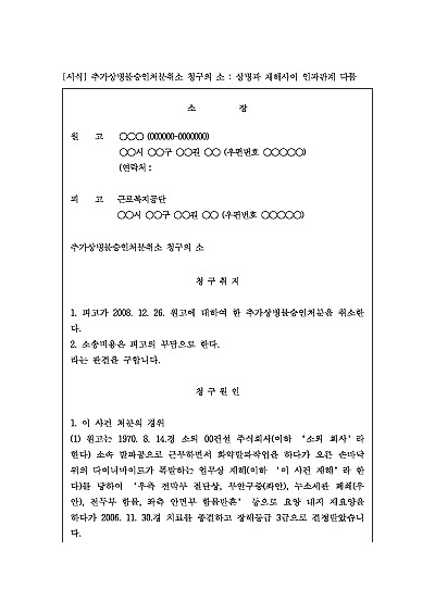 주요내용 : 근로복지공단(또는 관련 기관)이 사업주에게 부과한 산재보험료(또는 고용보험료) 징수 결정이 법령 위반, 절차상 하자, 사실과 다른 내용 등으로 부당하다고 판단될 때, 그 부과 처분의 취소를 구하기 위해 사용되어지는 소장 양식임. 단 무단전재 방지목적으로 PDF 파일로 올리니, 구매하신 후 혹 원본 파일이 필요하신 분들은 톡이나 문자, 메일, 전화 등을 주시면 작성방법 등에 대한 간단한 무료상담과 함께 원본 파일을 보내드리도록 하겠습니다.