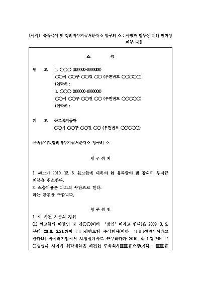 주요내용 근로자가 업무상 재해로 사망했을 때 유족이 근로복지공단(산재보험 관리 기관)에 유족급여와 장의비를 청구했으나, 공단이 업무상 재해로 인정하지 않거나 지급 요건 미달 등을 이유로 지급을 거부(부지급 처분)했을 때, 당해 처분의 위법 또는 부당함을 이유로 그 취소를 구하기 위한 목적으로 사용되어지는 소장 양식임단 무단전재 방지목적으로 PDF 파일로 올리니구매하신 후 혹 원본 파일이 필요하신 분들은 톡이나 문자메일전화 등을 주시면 작성방법 등에 대한 간단한 무료상담과 함께 원본 파일을 보내드리도록 하겠습니다.