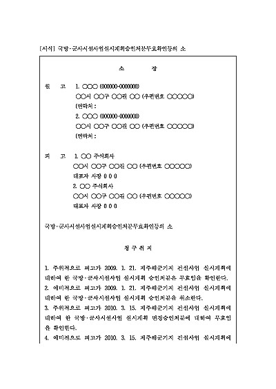 주요내용 : 국방부 장관 등이 국방·군사시설 사업을 위해 내린실시계획 승인이라는 행정처분이 법률상 하자가 있어 효력이 없음을 법원에 확인을 구하기 위한 목적으로 사용되어지는 소장 양식임. 단 무단전재 방지목적으로 PDF 파일로 올리니, 구매하신 후 혹 원본 파일이 필요하신 분들은 톡이나 문자, 메일, 전화 등을 주시면 작성방법 등에 대한 간단한 무료상담과 함께 원본 파일을 보내드리도록 하겠습니다.