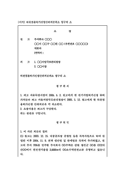 주요내용 : 하천 관리청이 하천 이용 신청(점용허가 신청)을 거부(반려)한 처분이 위법 또는 부당하다고 판단될 때, 당해 처분의 취소를 구할 목적으로 사용되어지는 소장 양식임. 단 무단전재 방지목적으로 PDF 파일로 올리니, 구매하신 후 혹 원본 파일이 필요하신 분들은 톡이나 문자, 메일, 전화 등을 주시면 작성방법 등에 대한 간단한 무료상담과 함께 원본 파일을 보내드리도록 하겠습니다.