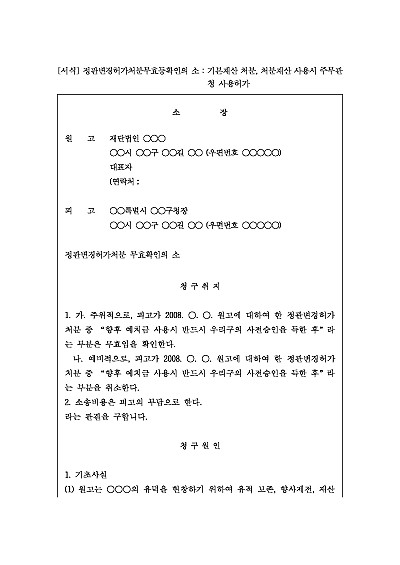 주요내용 : 비영리법인 등이 정관을 변경하기 위해 주무관청의 허가(인가)를 받았는데, 이 허가 처분 자체에 위법한 하자가 있어 그 허가 처분의 효력이 무효확인을 구할 목적으로 사용되어지는 소장 양식임. 단 무단전재 방지목적으로 PDF 파일로 올리니, 구매하신 후 혹 원본 파일이 필요하신 분들은 톡이나 문자, 메일, 전화 등을 주시면 작성방법 등에 대한 간단한 무료상담과 함께 원본 파일을 보내드리도록 하겠습니다.