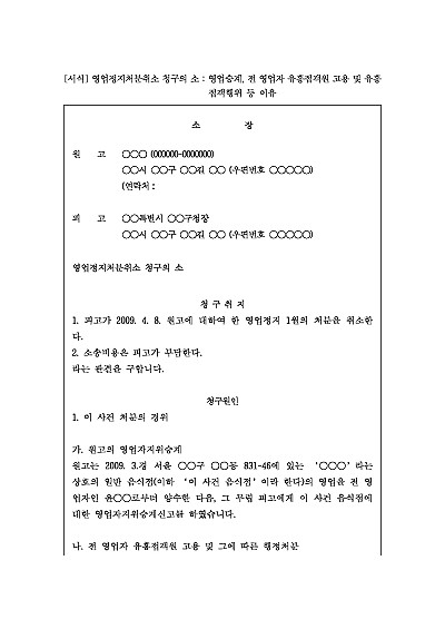 주요내용 : 행정청의 영업정지처분에 대하여 당해 처분의 위법 또는 부당함을 이유로 그 취소를 구하기 위한 목적으로 사용되어지는 소장 양식임. 단 무단전재 방지목적으로 PDF 파일로 올리니구매하신 후 혹 원본 파일이 필요하신 분들은 톡이나 문자메일전화 등을 주시면 작성방법 등에 대한 간단한 무료상담과 함께 원본 파일을 보내드리도록 하겠습니다.