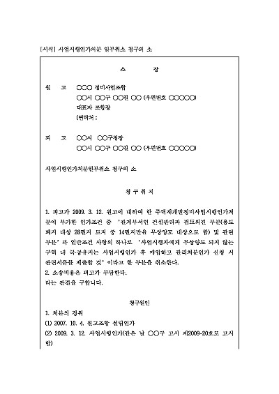 주요내용 : 도시정비사업의 사업시행인가라는 행정처분 중 특정 부분(예: 특정 구역, 특정 시설물 설치 등)이 위법하거나 부당하여, 해당 부분에 대한 효력의 취소 등을 구하기 위한 목적으로 사용되어지는 소장 양식임. 단 무단전재 방지목적으로 PDF 파일로 올리니, 구매하신 후 혹 원본 파일이 필요하신 분들은 톡이나 문자, 메일, 전화 등을 주시면 작성방법 등에 대한 간단한 무료상담과 함께 원본 파일을 보내드리도록 하겠습니다.