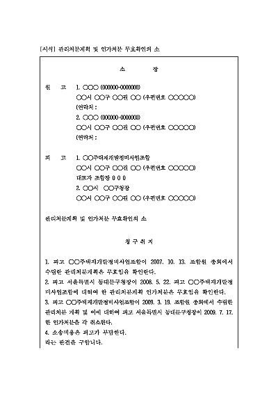 주요내용 : 사업에서 조합이 수립한 관리처분계획에 중대한 하자가 있어 법적 효력이 없음을 확인받기 위해 제기하는 소송 형태로, 법령에 위반되거나 중대한 절차상 하자가 있는 경우에 사용되어지는 소장 양식임. 단 무단전재 방지목적으로 PDF 파일로 올리니, 구매하신 후 혹 원본 파일이 필요하신 분들은 톡이나 문자, 메일, 전화 등을 주시면 작성방법 등에 대한 간단한 무료상담과 함께 원본 파일을 보내드리도록 하겠습니다.