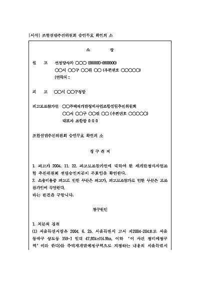 주요내용 : 정비사업을 추진하기 위해 구성된 추진위원회의 시·군·구청장(지자체) 승인 처분이 법적 요건을 갖추지 못했거나 절차상 하자가 있을 때, 당해 처분의 취소를 구할 목적으로 사용되어지는 소장 양식임단 무단전재 방지목적으로 PDF 파일로 올리니, 구매하신 후 혹 원본 파일이 필요하신 분들은 톡이나 문자, 메일, 전화 등을 주시면 작성방법 등에 대한 간단한 무료상담과 함께 원본 파일을 보내드리도록 하겠습니다.