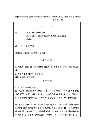 주요내용 외국인이 한국 국적을 취득하기 위하여 귀화(귀화허가) 신청을 하였지만 법무부장관이 불허(거부처분) 결정을 내렸을 때, 그 불허 결정의 위법 또는 부당함을 이유로 그 취소를 구하기 위한 목적으로 사용되어지는 소장 양식임단 무단전재 방지목적으로 PDF 파일로 올리니구매하신 후 혹 원본 파일이 필요하신 분들은 톡이나 문자메일전화 등을 주시면 작성방법 등에 대한 간단한 무료상담과 함께 원본 파일을 보내드리도록 하겠습니다.