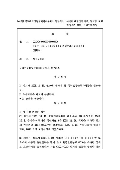 주요내용 외국인이 한국 국적을 취득하기 위하여 귀화(귀화허가) 신청을 하였지만 법무부장관이 불허(거부처분) 결정을 내렸을 때, 그 불허 결정의 위법 또는 부당함을 이유로 그 취소를 구하기 위한 목적으로 사용되어지는 소장 양식임단 무단전재 방지목적으로 PDF 파일로 올리니구매하신 후 혹 원본 파일이 필요하신 분들은 톡이나 문자메일전화 등을 주시면 작성방법 등에 대한 간단한 무료상담과 함께 원본 파일을 보내드리도록 하겠습니다.