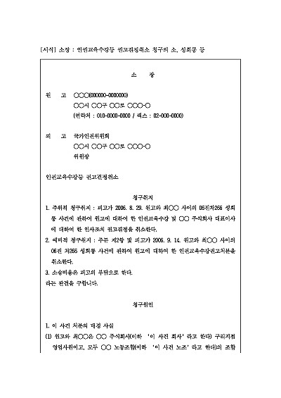 주요내용 : 국가인권위원회가 성희롱, 차별 등 인권침해 사건에서 피해자 구제 및 재발 방지를 위해 행한 '인권교육 수강' 및 '시정조치' 등의 권고 결정이 위법하거나 부당하다고 판단될 때, 해당 결정의 취소를 구하기 위한 목적으로 사용되어지는 소장 양식임. 단 무단전재 방지목적으로 PDF 파일로 올리니, 구매하신 후 혹 원본 파일이 필요하신 분들은 톡이나 문자, 메일, 전화 등을 주시면 작성방법 등에 대한 간단한 무료상담과 함께 원본 파일을 보내드리도록 하겠습니다.