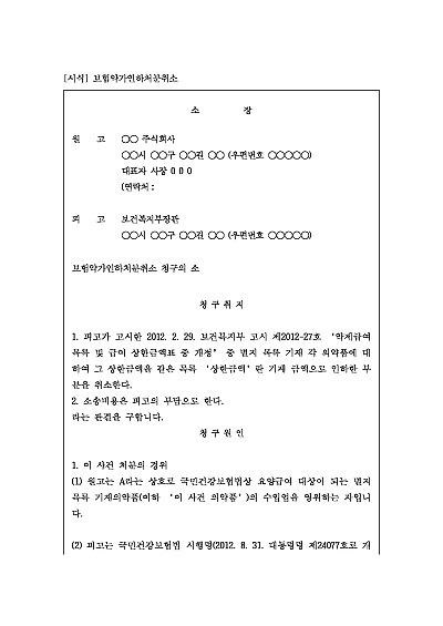 주요내용 : 제약회사나 관련 기관이 보건복지부 장관의 '약가인하 처분'(보험약가 인하 결정)이 부당하다고 판단될 때, 그 취소를 구하기 위한 목적으로 사용되어지는 소장 양식임. 단 무단전재 방지목적으로 PDF 파일로 올리니, 구매하신 후 혹 원본 파일이 필요하신 분들은 톡이나 문자, 메일, 전화 등을 주시면 작성방법 등에 대한 간단한 무료상담과 함께 원본 파일을 보내드리도록 하겠습니다.