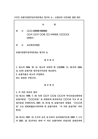 주요내용 : 건강보험공단이나 지자체로부터 부당한 사유로 업무정지 처분을 받은 요양기관(병원, 요양시설 등)이 해당 처분의 취소 등을 구할 목적으로 사용되어지는 소장 양식임. 단 무단전재 방지목적으로 PDF 파일로 올리니, 구매하신 후 혹 원본 파일이 필요하신 분들은 톡이나 문자, 메일, 전화 등을 주시면 작성방법 등에 대한 간단한 무료상담과 함께 원본 파일을 보내드리도록 하겠습니다.