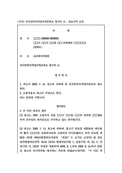 주요내용 : 보건복지부장관으로부터 받은 의사면허정지 처분에 대하여 당해 처분의 위법 또는 부당성을 이유로 그 취소를 구하기 위한 목적으로 사용되어지는 소장 양식임. 단 무단전재 방지목적으로 PDF 파일로 올리니, 구매하신 후 혹 원본 파일이 필요하신 분들은 톡이나 문자, 메일, 전화 등을 주시면 작성방법 등에 대한 간단한 무료상담과 함께 원본 파일을 보내드리도록 하겠습니다.
