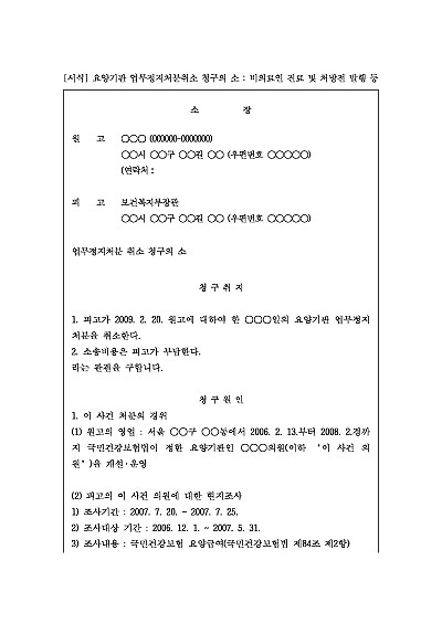 주요내용 : 국민건강보험공단이나 지자체로부터 부당한 사유로 업무정지 처분을 받은 요양기관이, 해당 처분이 위법·부당함을 이유로 그 취소를 구하기 위한 목적으로 사용되어지는 소장 양식임. 단 무단전재 방지목적으로 PDF 파일로 올리니, 구매하신 후 혹 원본 파일이 필요하신 분들은 톡이나 문자, 메일, 전화 등을 주시면 작성방법 등에 대한 간단한 무료상담과 함께 원본 파일을 보내드리도록 하겠습니다.