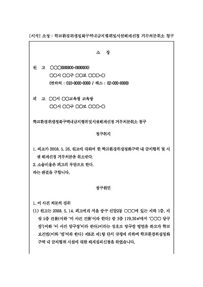 주요내용 : 학교 주변 교육환경 보호를 위해 설정된 구역(정화구역) 내에서 특정 시설 설치나 영업을 하고 싶지만, 교육청 등 행정청이 "해제해 줄 수 없다"고 거부하자, 그 거부 처분이 부당하다며 법원에 그 취소를 구하기 위한 목적으로 사용되어지는 소장 양식임. 단 무단전재 방지목적으로 PDF 파일로 올리니, 구매하신 후 혹 원본 파일이 필요하신 분들은 톡이나 문자, 메일, 전화 등을 주시면 작성방법 등에 대한 간단한 무료상담과 함께 원본 파일을 보내드리도록 하겠습니다.