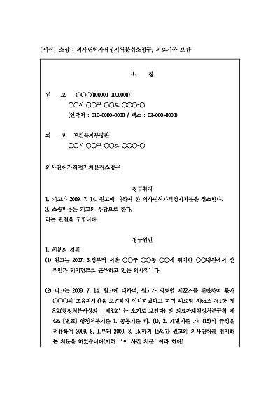 주요내용 : 정부나 의료기관으로부터 받은의사 면허 자격 정지 처분이 위법 또는 부당하다고 판단될 때 당해 처분의 취소를 구하기 위한 목적으로 사용되어지는 소장 양식임. 단 무단전재 방지목적으로 PDF 파일로 올리니, 구매하신 후 혹 원본 파일이 필요하신 분들은 톡이나 문자, 메일, 전화 등을 주시면 작성방법 등에 대한 간단한 무료상담과 함께 원본 파일을 보내드리도록 하겠습니다.