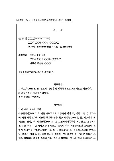 주요내용 : 행정청(예: 식품의약품안전처 또는 지방자치단체)이 특정 식품의 제조·가공·수입 또는 판매 등과 관련된 품목 허가나 신고를 받아들이지 않는 '거부 처분'에 대해 불복하여 그 취소를 구하기 위한 목적으로 사용되어지는 소장 양식임. 단 무단전재 방지목적으로 PDF 파일로 올리니, 구매하신 후 혹 원본 파일이 필요하신 분들은 톡이나 문자, 메일, 전화 등을 주시면 작성방법 등에 대한 간단한 무료상담과 함께 원본 파일을 보내드리도록 하겠습니다.