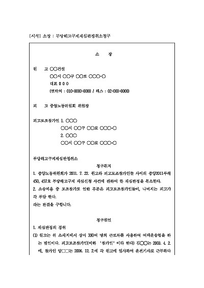 주요내용 : 지방노동위원회의 부당해고 구제 초심판정에 불복하여 중앙노동위원에 재심을 신청한 결과에 대해 다시 법원에 그 취소를 구하기 위한 목적으로 사용되어지는 소장 양식임. 단 무단전재 방지목적으로 PDF 파일로 올리니, 구매하신 후 혹 원본 파일이 필요하신 분들은 톡이나 문자, 메일, 전화 등을 주시면 작성방법 등에 대한 간단한 무료상담과 함께 원본 파일을 보내드리도록 하겠습니다.