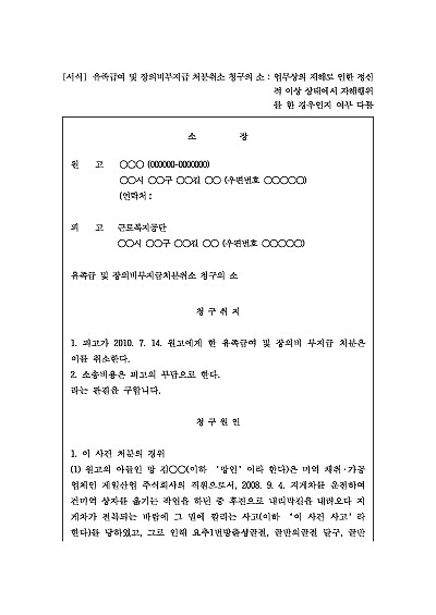 주요내용 근로자가 업무상 재해로 사망했을 때 유족이 근로복지공단(산재보험 관리 기관)에 유족급여와 장의비를 청구했으나, 공단이 업무상 재해로 인정하지 않거나 지급 요건 미달 등을 이유로 지급을 거부(부지급 처분)했을 때, 당해 처분의 위법 또는 부당함을 이유로 그 취소를 구하기 위한 목적으로 사용되어지는 소장 양식임단 무단전재 방지목적으로 PDF 파일로 올리니구매하신 후 혹 원본 파일이 필요하신 분들은 톡이나 문자메일전화 등을 주시면 작성방법 등에 대한 간단한 무료상담과 함께 원본 파일을 보내드리도록 하겠습니다.