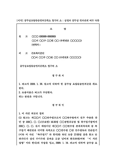 주요내용 : 공무상재해를 이유로 요양승인청을 하지만 요양불승인결정이 된 경우 당해 처분의 위법 또는 부당성을 이유로 그 취소를 구하기 위한 목적으로 사용되어지는 소장 양식임. 단 무단전재 방지목적으로 PDF 파일로 올리니, 구매하신 후 혹 원본 파일이 필요하신 분들은 톡이나 문자, 메일, 전화 등을 주시면 작성방법 등에 대한 간단한 무료상담과 함께 원본 파일을 보내드리도록 하겠습니다.