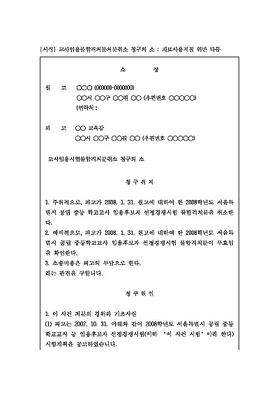 주요내용 : 교원임용시험에 응시한 수험생이 시험 주관 기관의 불합격 결정(처분)이 위법하다고 판단될 경우. 당해 처분의 취소를 구하기 위한 목적으로 사용되어지는 소장 양식임. 단 무단전재 방지목적으로 PDF 파일로 올리니, 구매하신 후 혹 원본 파일이 필요하신 분들은 톡이나 문자, 메일, 전화 등을 주시면 작성방법 등에 대한 간단한 무료상담과 함께 원본 파일을 보내드리도록 하겠습니다.