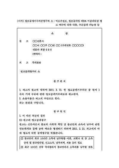 주요내용 :정보공개청구에 대한 공공기관의 비공개 또는 부분공개 결정에 대하여, 당해 처분이 위법 또는 부당함을 이유로 그 취소를 구하지 위한 목적으로 사용되어지는 소장 양식임단 무단전재 방지목적으로 PDF 파일로 올리니구매하신 후 혹 원본 파일이 필요하신 분들은 톡이나 문자메일전화 등을 주시면 작성방법 등에 대한 간단한 무료상담과 함께 원본 파일을 보내드리도록 하겠습니다.