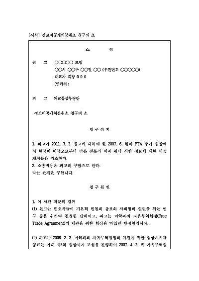 주요내용 :정보공개청구에 대한 공공기관의 비공개 또는 부분공개 결정에 대하여, 당해 처분이 위법 또는 부당함을 이유로 그 취소를 구하지 위한 목적으로 사용되어지는 소장 양식임단 무단전재 방지목적으로 PDF 파일로 올리니구매하신 후 혹 원본 파일이 필요하신 분들은 톡이나 문자메일전화 등을 주시면 작성방법 등에 대한 간단한 무료상담과 함께 원본 파일을 보내드리도록 하겠습니다.