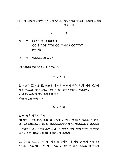 주요내용 :정보공개청구에 대한 공공기관의비공개 또는 부분공개 결정에 대하여, 당해 처분이 위법 또는 부당함을 이유로 그 취소를 구하지 위한 목적으로 사용되어지는 소장 양식임. 단 무단전재 방지목적으로 PDF 파일로 올리니, 구매하신 후 혹 원본 파일이 필요하신 분들은 톡이나 문자, 메일, 전화 등을 주시면 작성방법 등에 대한 간단한 무료상담과 함께 원본 파일을 보내드리도록 하겠습니다.