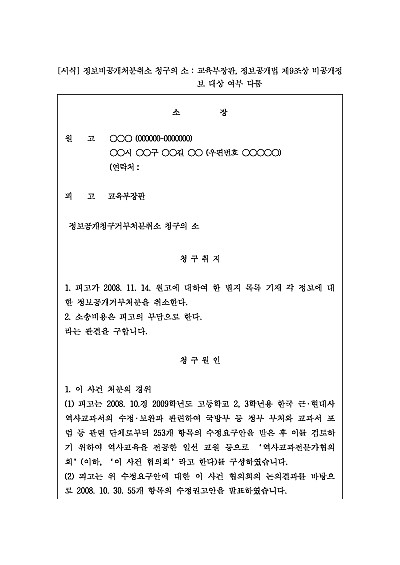 주요내용 정보공개청구에 대한 공공기관의 비공개 또는 부분공개 결정에 대하여, 당해 처분이 위법 또는 부당함을 이유로 그 취소를 구하지 위한 목적으로 사용되어지는 소장 양식임단 무단전재 방지목적으로 PDF 파일로 올리니구매하신 후 혹 원본 파일이 필요하신 분들은 톡이나 문자메일전화 등을 주시면 작성방법 등에 대한 간단한 무료상담과 함께 원본 파일을 보내드리도록 하겠습니다