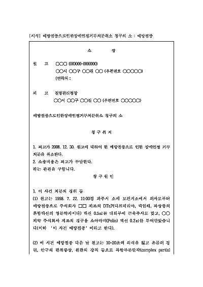 주요내용 : 예방접종을 맞은 후 발생한 장애에 대해 정부(보건복지부장관 또는 질병관리청장)가 '인과관계가 없다'며 장애인정을 거부하는 처분을 내렸을 때, 당해 처분의 위법 또는 부당함을 이유로 그 취소를 구하기 위한 목적으로 사용되어지는 소장 양식임. 단 무단전재 방지목적으로 PDF 파일로 올리니, 구매하신 후 혹 원본 파일이 필요하신 분들은 톡이나 문자, 메일, 전화 등을 주시면 작성방법 등에 대한 간단한 무료상담과 함께 원본 파일을 보내드리도록 하겠습니다.