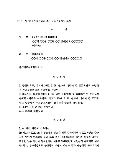 주요내용 : 행정청이 내린 처분에 중대하고 명백한 하자가 있어 처음부터 효력이 없는 '무효'인 처분의 무효 상태를 법원으로부터 공식적으로 확인받기 위해 제기하는 소송형태임. 단 무단전재 방지목적으로 PDF 파일로 올리니, 구매하신 후 혹 원본 파일이 필요하신 분들은 톡이나 문자, 메일, 전화 등을 주시면 작성방법 등에 대한 간단한 무료상담과 함께 원본 파일을 보내드리도록 하겠습니다.