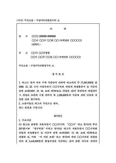 주요내용 : 지방자치단체의 위법한 재무회계나 공금 지출, 재산 관리 등에 대해 해당 지역 주민이 감사청구 후, 그 시정을 요구하기 위해 지방자치단체장을 상대로 제기하기 위한 목적으로 사용되어지는 소장 양식임. 단 무단전재 방지목적으로 PDF 파일로 올리니, 구매하신 후 혹 원본 파일이 필요하신 분들은 톡이나 문자, 메일, 전화 등을 주시면 작성방법 등에 대한 간단한 무료상담과 함께 원본 파일을 보내드리도록 하겠습니다.