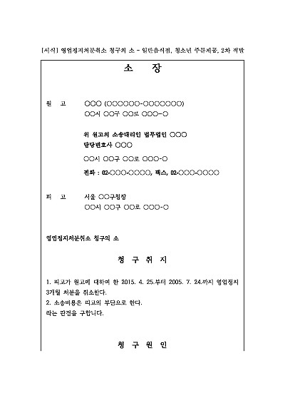 주요내용 식당 등 영업자가 청소년에게 술을 판매했다가 적발되어 받은 1~2개월의 식품위생법상 영업정지처분이 부당하거나 과하다며 당해 처분의 취소나 경감을 구하기 위한 목적으로 사용되어지는 소장 양식임단 무단전재 방지 목적으로 PDF 파일로 올리니구매하신 후 혹 원본 파일이 필요하신 분들은 톡이나 문자메일전화 등을 주시면 작성 방법 등에 대한 간단한 무료 상담과 함께 원본 파일을 보내드리도록 하겠습니다.
