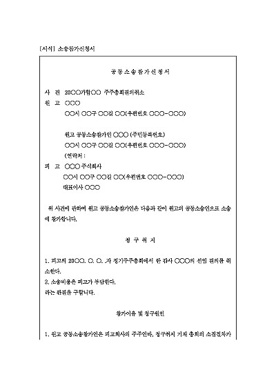주요내용 : 소송의 결과가 당사자 일방과 제3자에게 '합일적으로 확정'되어야 할 때, 그 제3자가 원고나 피고의 '공동소송인'으로 소송에 참여하여 판결의 효력을 받도록 할 목적으로 사용되어지는 신청서 양식임. 단 무단전재 방지목적으로 PDF 파일로 올리니, 구매하신 후 혹 원본 파일이 필요하신 분들은 톡이나 문자, 메일, 전화 등을 주시면 작성방법 등에 대한 간단한 무료상담과 함께 원본 파일을 보내드리도록 하겠습니다.