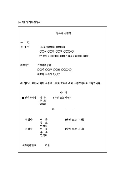 주요내용 : 여러 사람이 공동의 이해관계를 가지고 공동소송을 해야 할 때, 그들 모두를 대표하여 소송을 수행할 한 명의 당사자(선정당사자)를 선정하기 위한 목적으로 사용되어지는 신청서 양식임. 단 무단전재 방지목적으로 PDF 파일로 올리니, 구매하신 후 혹 원본 파일이 필요하신 분들은 톡이나 문자, 메일, 전화 등을 주시면 작성방법 등에 대한 간단한 무료상담과 함께 원본 파일을 보내드리도록 하겠습니다.
