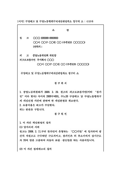 주요내용 : 중앙노동위원회의 재심판정에 불복하여 당해 판정의 위법 또는 부당함을 이유로 그 취소를 구하기 위한 목적으로사용되어지는 소장 양식임. 단 무단전재 방지목적으로 PDF 파일로 올리니구매하신 후 혹 원본 파일이 필요하신 분들은 톡이나 문자메일전화 등을 주시면 작성방법 등에 대한 간단한 무료상담과 함께 원본 파일을 보내드리도록 하겠습니다.