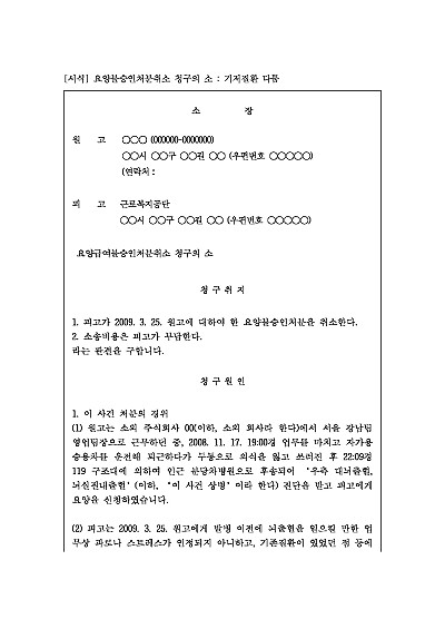 주요내용 근로복지공단 등이 산재 요양급여 신청을 거부한 결정(불승인 처분)이 위법 또는 부당하다고 판단될 때 당해 처분의 취소를 구하기 위한 목적으로 사용되어지는 소장 양식임단 무단전재 방지목적으로 PDF 파일로 올리니구매하신 후 혹 원본 파일이 필요하신 분들은 톡이나 문자메일전화 등을 주시면 작성방법 등에 대한 간단한 무료상담과 함께 원본 파일을 보내드리도록 하겠습니다.