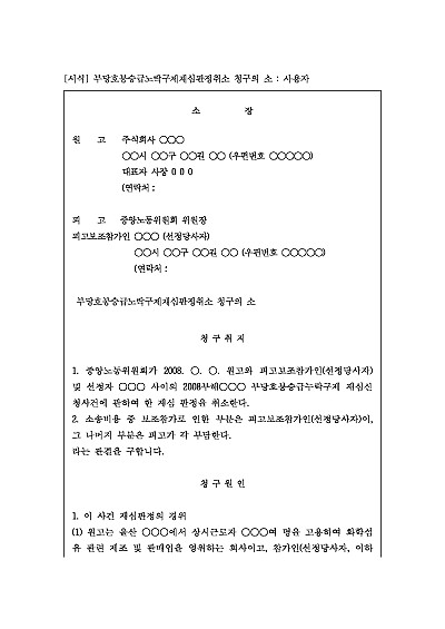 주요내용 : 중앙노동위원회의 재심판정에 불복하여 당해 판정의 위법 또는 부당함을 이유로 그 취소를 구하기 위한 목적으로사용되어지는 소장 양식임. 단 무단전재 방지목적으로 PDF 파일로 올리니구매하신 후 혹 원본 파일이 필요하신 분들은 톡이나 문자메일전화 등을 주시면 작성방법 등에 대한 간단한 무료상담과 함께 원본 파일을 보내드리도록 하겠습니다.