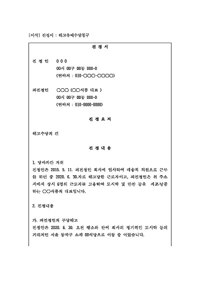 주요내용 : 사용자가 근로자를 해고하려면 적어도 30일 전에 그 사실을 예고해야 하며, 만약 30일 전에 예고를 하지 않았을 경우, 그에 갈음하여 30일분 이상의 통상임금을 해고와 동시에 지급해야 하는데, 이때 그 지급을 구하기 위한 목적으로 사용되어지는 진정서 양식임. 단 무단전재 방지 목적으로 PDF 파일로 올리니, 구매하신 후 혹 원본 파일이 필요하신 분들은 톡이나 문자, 메일, 전화 등을 주시면 작성 방법 등에 대한 간단한 무료 상담과 함께 원본 파일을 보내드리도록 하겠습니다.
