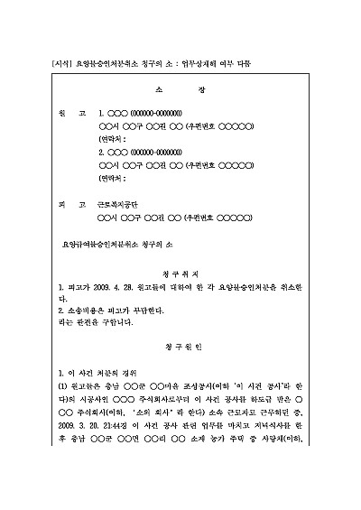 주요내용 근로복지공단 등이 산재 요양급여 신청을 거부한 결정(불승인 처분)이 위법 또는 부당하다고 판단될 때 당해 처분의 취소를 구하기 위한 목적으로 사용되어지는 소장 양식임단 무단전재 방지목적으로 PDF 파일로 올리니구매하신 후 혹 원본 파일이 필요하신 분들은 톡이나 문자메일전화 등을 주시면 작성방법 등에 대한 간단한 무료상담과 함께 원본 파일을 보내드리도록 하겠습니다.