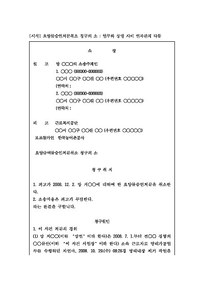 주요내용 근로복지공단 등이 산재 요양급여 신청을 거부한 결정(불승인 처분)이 위법 또는 부당하다고 판단될 때 당해 처분의 취소를 구하기 위한 목적으로 사용되어지는 소장 양식임단 무단전재 방지목적으로 PDF 파일로 올리니구매하신 후 혹 원본 파일이 필요하신 분들은 톡이나 문자메일전화 등을 주시면 작성방법 등에 대한 간단한 무료상담과 함께 원본 파일을 보내드리도록 하겠습니다.
