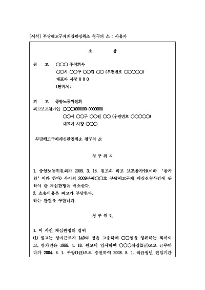 주요내용 : 중앙노동위원회의 재심판정에 불복하여 당해 판정의 위법 또는 부당함을 이유로 그 취소를 구하기 위한 목적으로사용되어지는 소장 양식임. 단 무단전재 방지목적으로 PDF 파일로 올리니구매하신 후 혹 원본 파일이 필요하신 분들은 톡이나 문자메일전화 등을 주시면 작성방법 등에 대한 간단한 무료상담과 함께 원본 파일을 보내드리도록 하겠습니다.