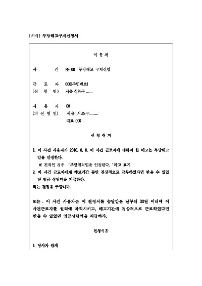 주요내용 : 부당해고 구제신청이란 근로기준법상 정당한 이유 없이 해고당한 근로자가 부당해고가 있었던 날부터 3개월 이내에 노동위원회에 신청하여 복직하거나 금전적 보상을 받는 구제 절차이며, 신청서를 제출하면 노동위원회는 해고의 정당성을 심리하고, 부당하다고 판정되면 원직 복직, 해고 기간 동안의 임금 상당액 지급 등의 명령을 내리며, 불복 시 중앙노동위원회 재심 및 행정소송으로 이어질 수 있다.