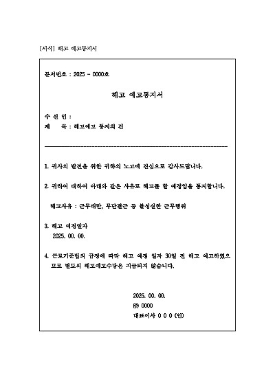 주요내용 :사용자가 근로자를 해고할 때, 30일 전까지 해고사유와 해고시기를 서면으로 통지해야 하는 문서 양식임 . 단 무단전재 방지 목적으로 PDF 파일로 올리니, 구매하신 후 혹 원본 파일이 필요하신 분들은 톡이나 문자, 메일, 전화 등을 주시면 작성 방법 등에 대한 간단한 무료 상담과 함께 원본 파일을 보내드리도록 하겠습니다.