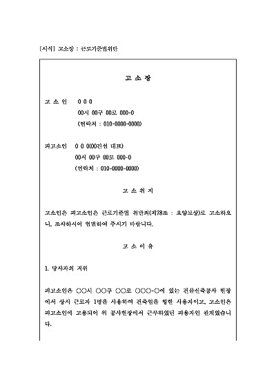 주요내용 : 임금 체불, 부당 해고 등 근로기준법 위반 행위에 대해 사용자를 처벌해 달라며 수사기관(고용노동부)에 공식적으로 요구하기 위한 목적으로 사용되어지는 고소장 양식임. 단 무단전재 방지 목적으로 PDF 파일로 올리니, 구매하신 후 혹 원본 파일이 필요하신 분들은 톡이나 문자, 메일, 전화 등을 주시면 작성 방법 등에 대한 간단한 무료 상담과 함께 원본 파일을 보내드리도록 하겠습니다.
