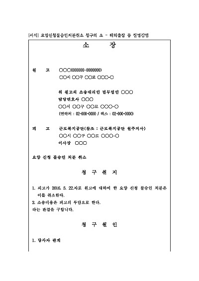 주요내용 근로복지공단이 산재 요양(치료 및 휴업급여신청을 불승인했을 때이에 불복하여 해당 결정이 위법·부당함을 주장하며 취소를 요구할 때 사용되어지는 소장 양식임단 무단전재 방지목적으로 PDF 파일로 올리니구매하신 후 혹 원본 파일이 필요하신 분들은 톡이나 문자메일전화 등을 주시면 작성방법 등에 대한 간단한 무료상담과 함께 원본 파일을 보내드리도록 하겠습니다.