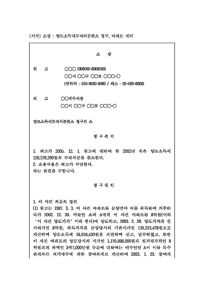 주요내용 : 과세 당국(세무서 등)으로부터 받은 양도소득세 부과 처분이 위법 또는 부당하다고 판단될 경우, 납세자가 해당 처분의 취소 또는 변경을 구할 목적으로 사용되어지는 소장 양식임. 단 무단전재 방지목적으로 PDF 파일로 올리니, 구매하신 후 혹 원본 파일이 필요하신 분들은 톡이나 문자, 메일, 전화 등을 주시면 작성방법 등에 대한 간단한 무료상담과 함께 원본 파일을 보내드리도록 하겠습니다.