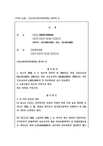 주요내용 : 과세 당국(세무서)이 개인에게 근로소득세를 부과한 처분에 위법 또는 부당한 점이 있다고 판단될 때, 납세자가 해당 처분의 취소 또는 변경을 구하기 위한 목적으로 사용되어지는 소장 양식임. 단 무단전재 방지목적으로 PDF 파일로 올리니, 구매하신 후 혹 원본 파일이 필요하신 분들은 톡이나 문자, 메일, 전화 등을 주시면 작성방법 등에 대한 간단한 무료상담과 함께 원본 파일을 보내드리도록 하겠습니다.