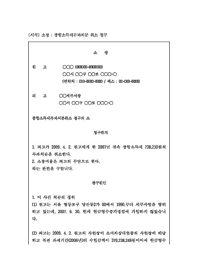 주요내용 : 납세자가 세무 당국으로부터 받은 종합소득세 부과 처분이 위법하거나 부당하다고 판단될 때, 해당 처분의 취소를 구하기 위한 목적으로 사용되어지는 소장 양식임. 단 무단전재 방지목적으로 PDF 파일로 올리니, 구매하신 후 혹 원본 파일이 필요하신 분들은 톡이나 문자, 메일, 전화 등을 주시면 작성방법 등에 대한 간단한 무료상담과 함께 원본 파일을 보내드리도록 하겠습니다.